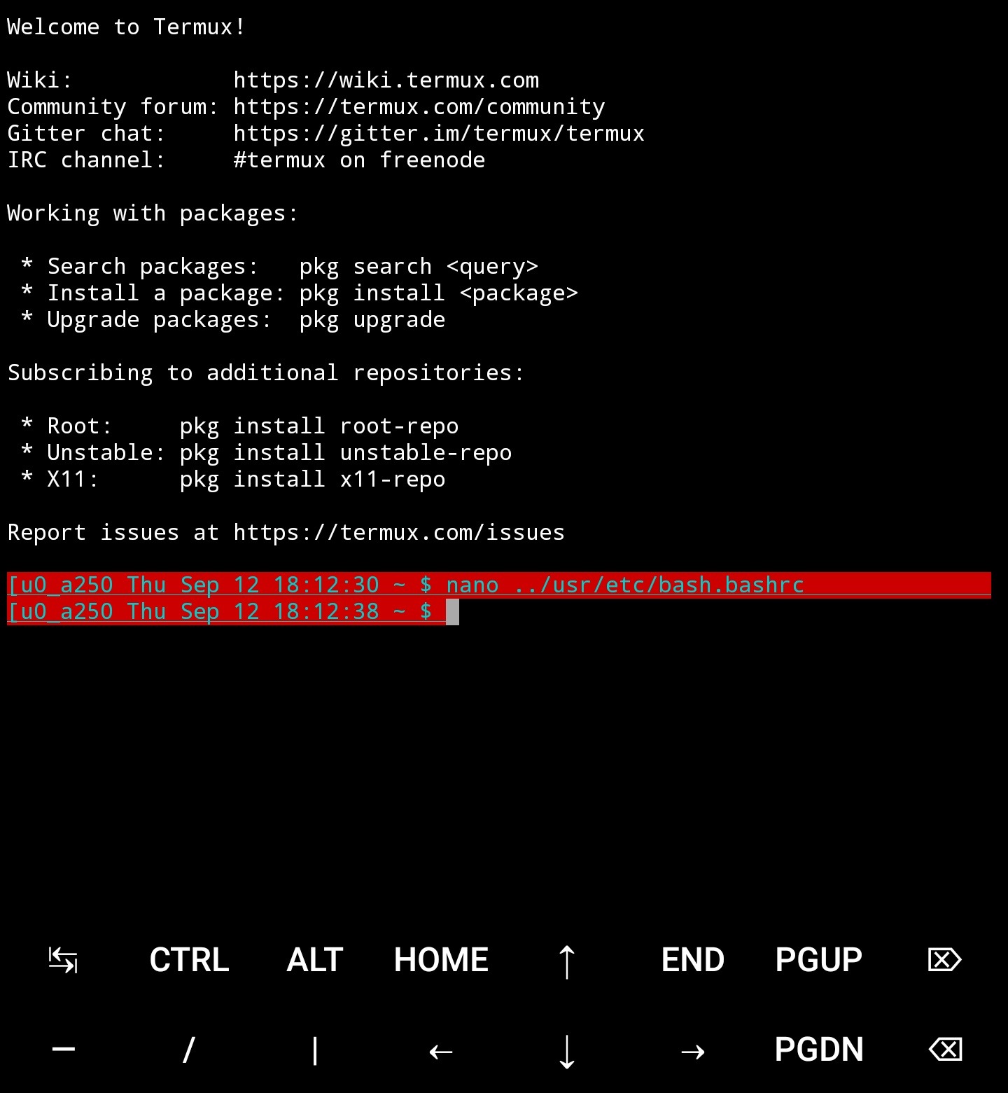 Начиная с версии Termux v0.66, панель дополнительных клавиш может быть настроена пользователем. Для этого нужно отредактировать файл "~/.termux/termux.properties" (через терминал!). Если файла нет, то его нужно создать. Прежде всего, стоит убедиться что папка ".termux" существует, для этого выполним команду