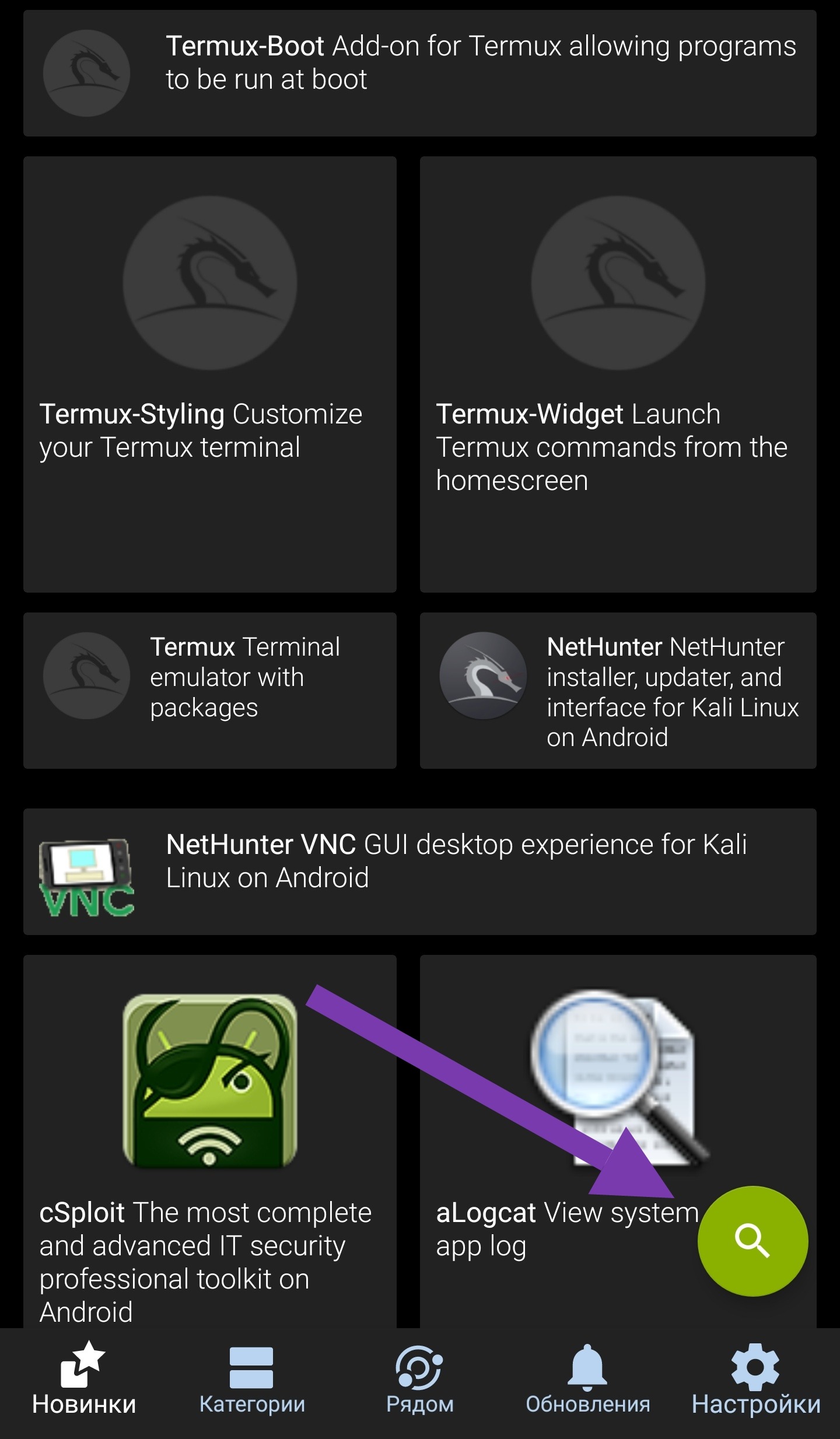 Kali NetHunter App Store созданный на базе того же F-Droid, но немного модифицированной версии. Ключевым отличием этого маркета от предыдущего является наличие приложений исключительно связанных с безопасностью