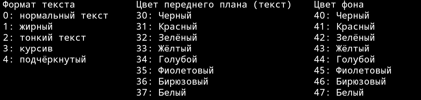 Мы будем использовать специальный символ \e в начале и m в конце, чтобы указать, что далее прописана последовательность цветов.