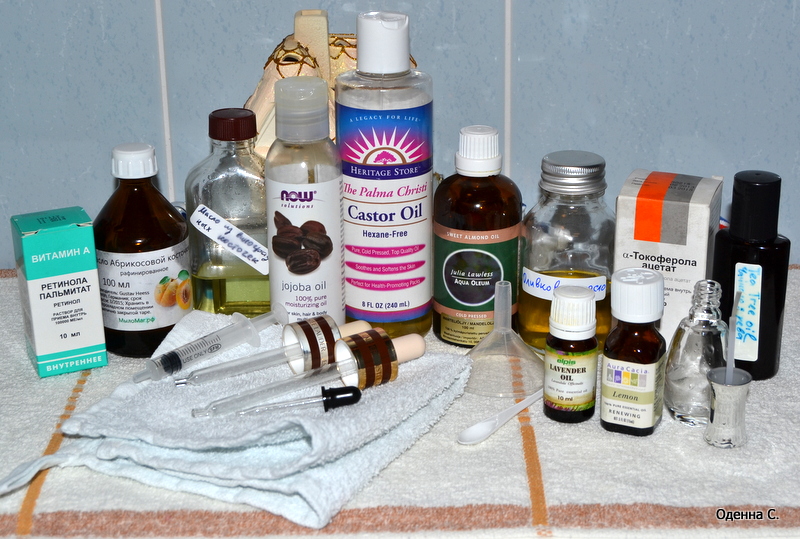 Средство хранится в холодильнике и применяется для ежедневного ухода, за сухой кутикулой и ломкими, расслаивающимися ногтями . Рецепт № 2 . По 3 капли эфирных масел лаванды, чайного дерева и эвкалипта разбавить столовой ложкой касторового масла .