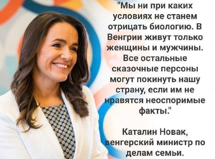 «мы ни при каких условиях не станем отрицать биологию . в венгрии живут только женщины и мужчины . все остальные сказочные персоны могут покинуть нашу страну, если им не нравятся неоспоримые факты» . каталин новак . . .