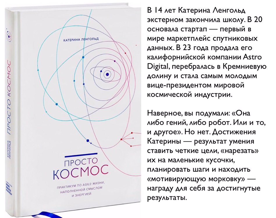 Сейчас вы это читаете и думаете: «Она либо гений, либо робот. Может, и то и другое». Совсем нет. Я встречала настоящих гениев, поэтому точно знаю, что я не в их числе. У меня хорошая память и неплохие математические способности, но на этом, пожалуй, все. Все мои достижения — результат упертости и умения ставить четкие цели, нарезать их на маленькие кусочки, планировать шаги для их реализации и находить мотивирующую морковку — награду за достигнутые результаты.