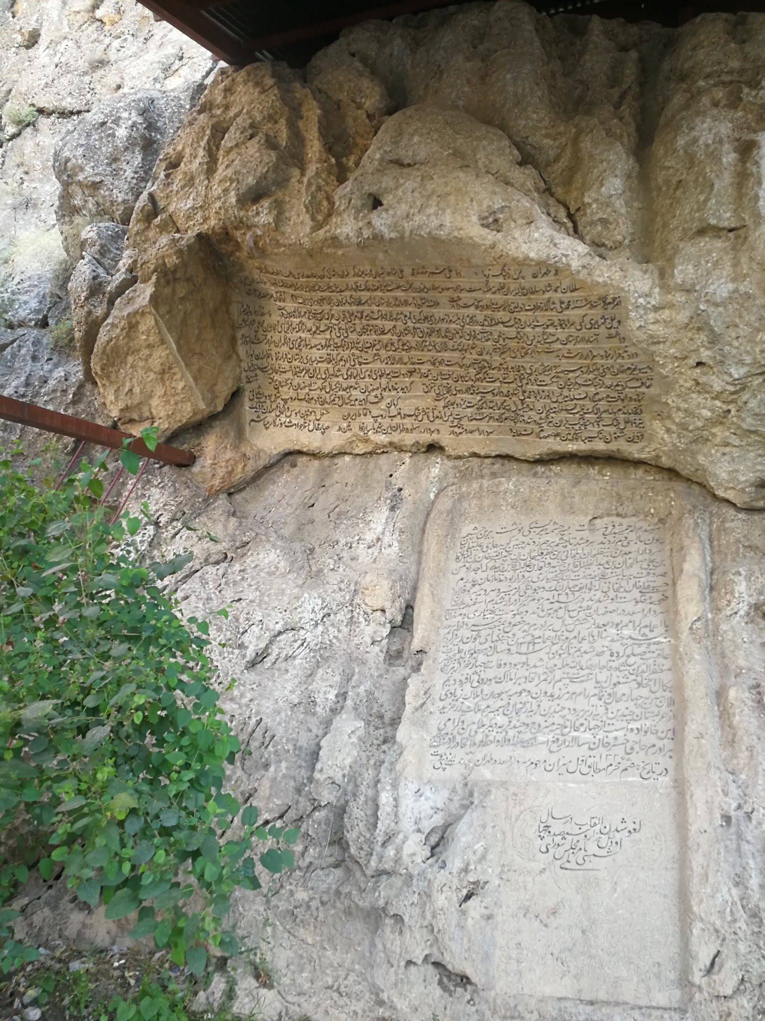 ⬇️کتیبه در چهار قسمت مجزا به سینه صخرهها و به ترتیب زمان وقایع از راست به چپ حجاری شدهاند. کتیبه سوم تقریبا در حد فاصل و زیر دو کتیبه ابتدایی قرار گرفته که خود شامل دو بخش مجزا است. نوع خط کتیبهها نستعلیق که گاه با شکسته آمیخته شده است.