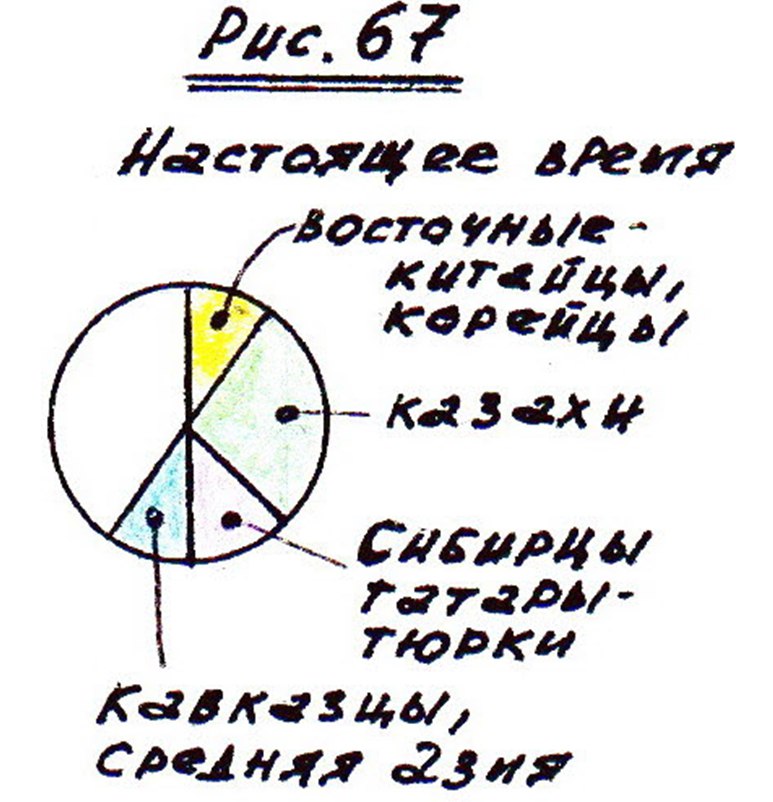 хотя официально считается, что белых много, но на самом деле их уже меньше половины. Т.е. под белыми я имею в виду - русские, украинцы, белорусы, поляки, финны немцы, чехи вес белые, которые проживают здесь. Тот клин, который еще на рис 66 занимали белые, теперь заняли кавказцы и представители Средней Азии. Очень много татар-сибирцев переехало в районы, или в Татарстан, а мы город разбираем, т.е. по сравнению с этим татар – сибирцев стало меньше. Но увеличилась численность казахов, т.е. киргизов - кайсаков. Они почти уже догоняют численность белого населения. А почему? А потому что у них в семьях по 10,по 12 детей. Т.е. плодятся и размножаются. Но у нас еще появился клин, и в него полезли восточные народы: корейцы, вьетнамцы, китайцы, якуты, лаосцы, индусы даже, т.е. все с Дальнего востока в этот клин. И заметьте, сколько территории они заняли. А из-за чего? А из-за того, что белые не размножаются. Один два ребенка. И психологию навязывают средства массовой информации: А зачем нищету плодить? А чем их кормить? А зачем это надо? Живите для себя. И т.д. и т.п. Помните принцип: Если не можем победить, мы должны их выродить. Либо создать все условия, чтобы они вымерли, как мамонты.