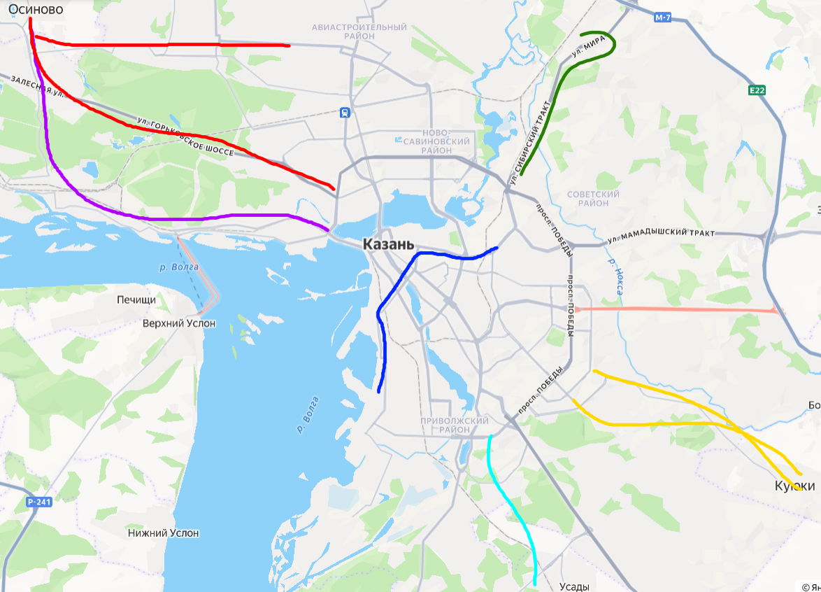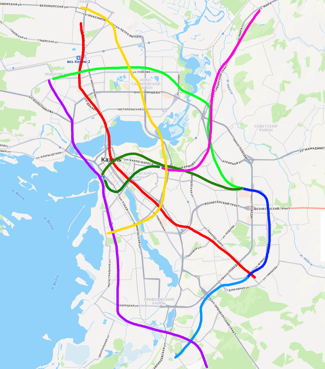 Там же на Новой Портовой можно повернуть в сторону ж/д вокзала или оставить это направление отдельной фиолетовой ветке из Кировского района, которая должна соединить восточный въезд в город с центром и вокзалом, и заодно на разъезде Восстания слиться с (бледно-зелёной) перпективной веткой, ведущей в сторону кварталов и Компрессорного, вплоть до существующего азинского синего коротыша. А с юга фиолетовая ветка может пройти вдоль всей промзоны перспективной зоны околоволжской застройки и пересекая уже запланированный голубой отрезок выйти на активно застраиваемый высотками район Усад. Продолжение метро в сторону Кабанов и Аэропорта оставим для обсуждения нашим внукам и правнукам.