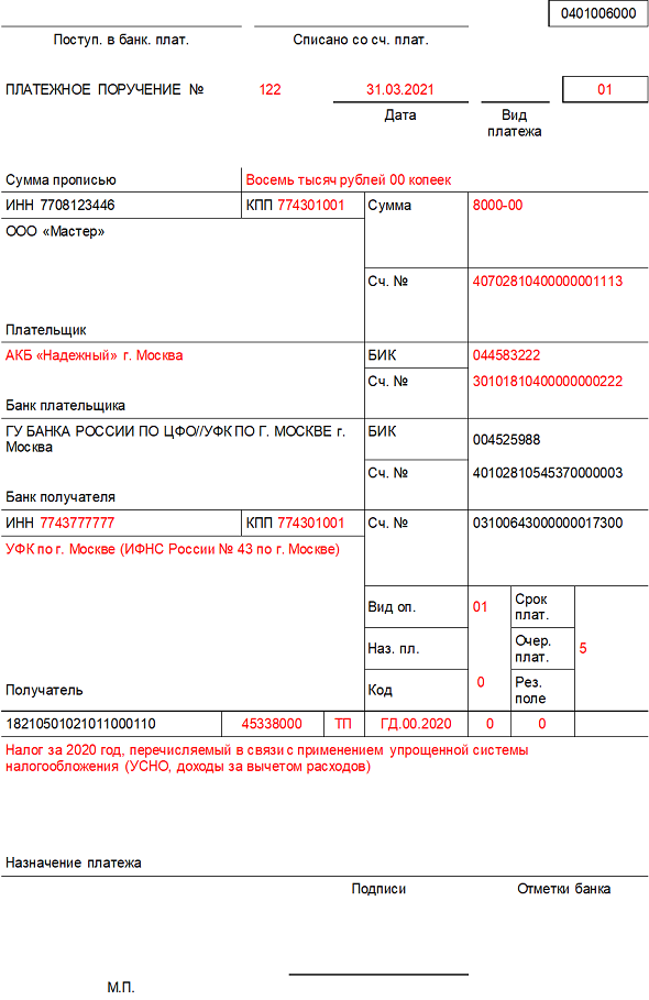 Кбк для уплаты налогов усн