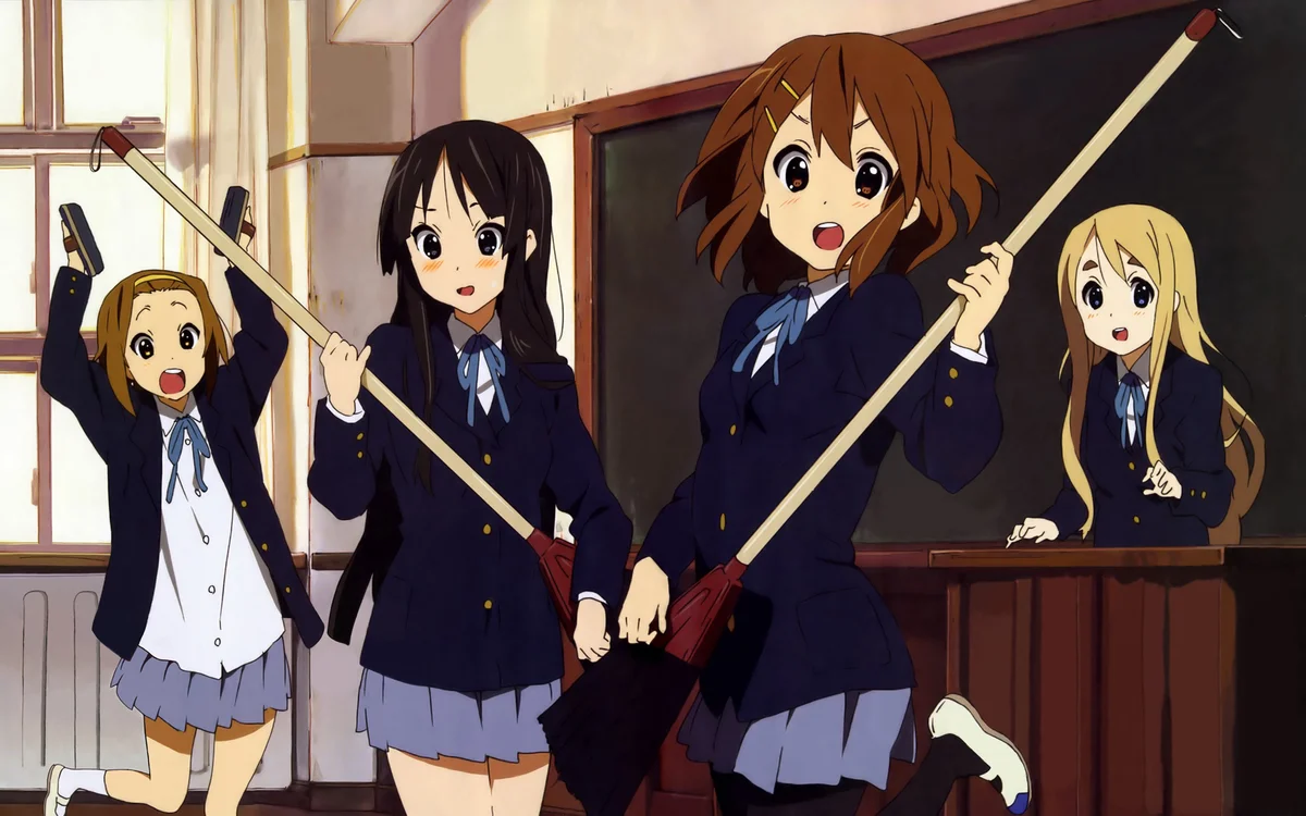 На самом деле никто из участниц кружка не выделяется особым талантом или даже неоспоримой любовью к музыке. Мио и Рицу вроде как договорились в былые времена, что соберут группу и покорят главную арену Японии «Будокан» — просто потому, что это прикольно. Отсюда и выросла идея записаться в клуб, а дедлайном для финального концерта на суперплощадке решили назначить окончание школы. Вижу цель — не спеша и вразвалочку иду к ней: выяснилось, что из тематического кружка можно почерпнуть нечто более ценное, чем достигаторскую мотивацию заблистать на сцене так же, как ребята из P-Model или The Pillows (их фамилии, кстати, и достались героиням тайтла).