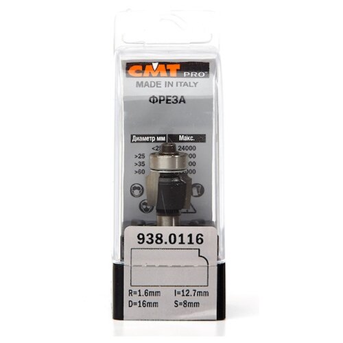 Freze takımı iç yarıçapı R=1,6 alt yatak S8 D16 I12.7 L54 CMT PRO 938.0116 D.16 l.12.7 L.54 R.1.6 S.8 Rulman serisi 938 ile freze takımları iç yarıçapı İç yarıçaplı ve alt yataklı freze takımları, masa tablalarının, basamakların, korkulukların vb. keskin kenarlarını kolayca yuvarlamanıza yardımcı olur. 2 ve 3 mm yarıçaplı kesiciler, lamine suntadan yapılmış mobilyalar için PVC kenarlarındaki çıkıntıların frezelenmesinde kullanılır. Freze yüksekliğini değiştirerek çizimdeki gibi bir adım elde edebilirsiniz. Bu kesiciler 937 serisi ile birlikte açma derzleri yapmak için kullanılabilir.