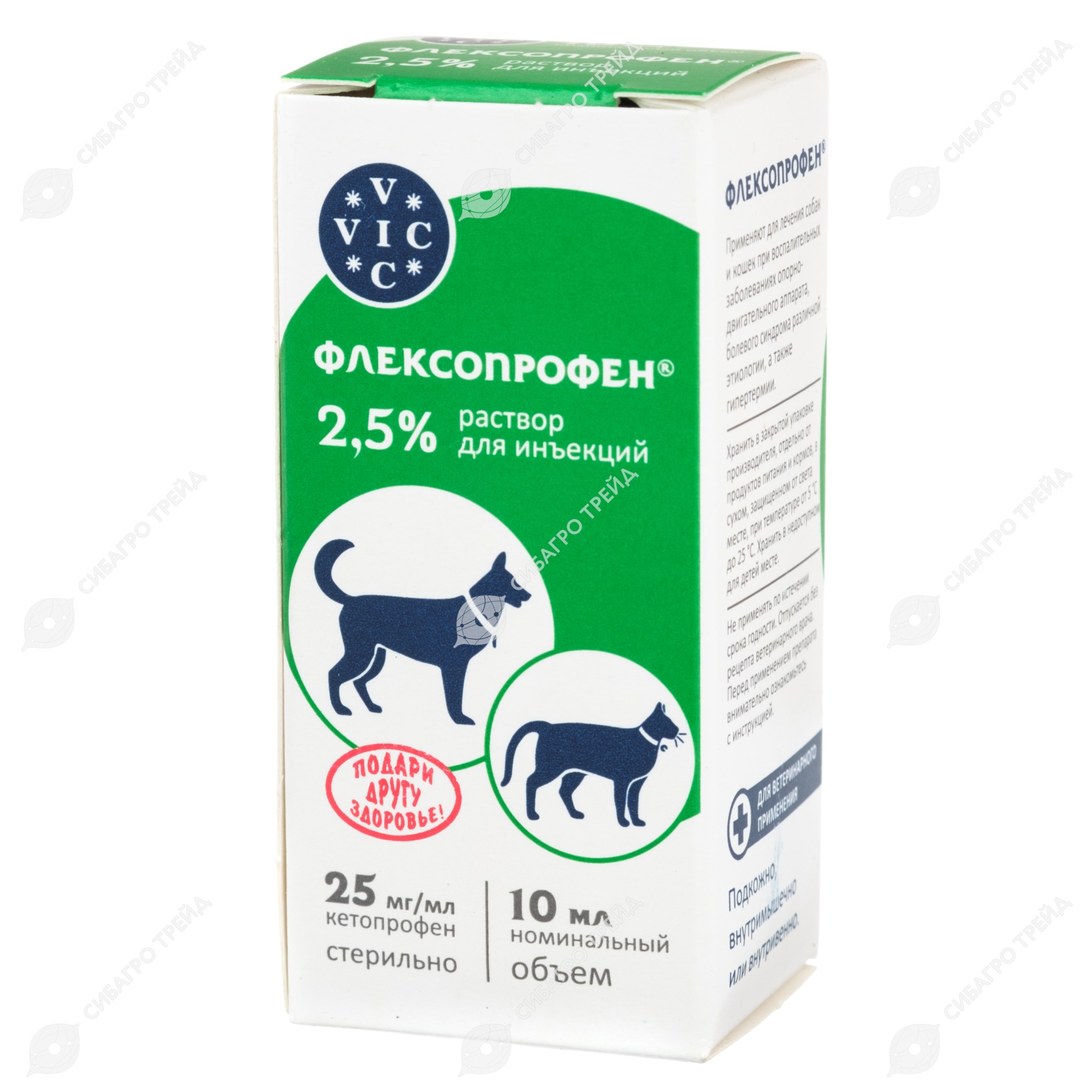 ФЛЕКСОПРОФЕН 2,5 % (Кетопрофен) раствор для инъекций (10 мл) Vic equalizer Лечение воспалительных заболеваний опорно-двигательного аппарата (артриты, артрозы, вывихи, отеки, синовиты, теносиновиты и т .п .), болевого синдрома различной этиологии (травматическая и послеоперационная боль, колики), а также гипертермии у лошадей, телят, собак и кошек .
