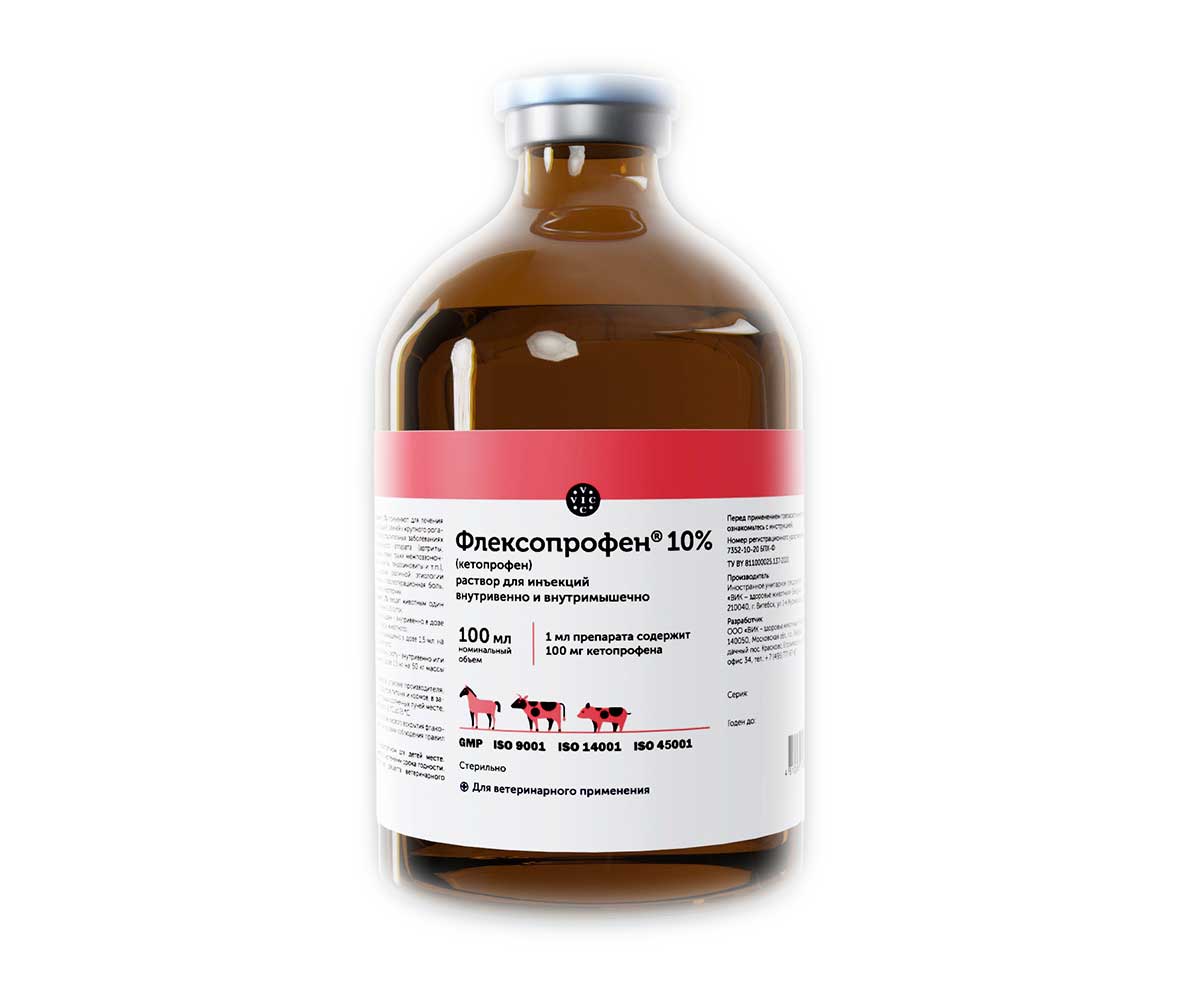 флексопрофен 2,5%, 5% и 10% (flexoprofen 2,5%, 5%, 10%) - нестероидное противовоспалительное лекарственное средство в форме раствора для инъекций, применяемое для лечения воспалительных заболеваний опорно-двигательного аппарата и в качестве обезболивающего и жаропонижающего средства у собак, кошек, спортивных лошадей и телят и содержащее в 1 мл в …