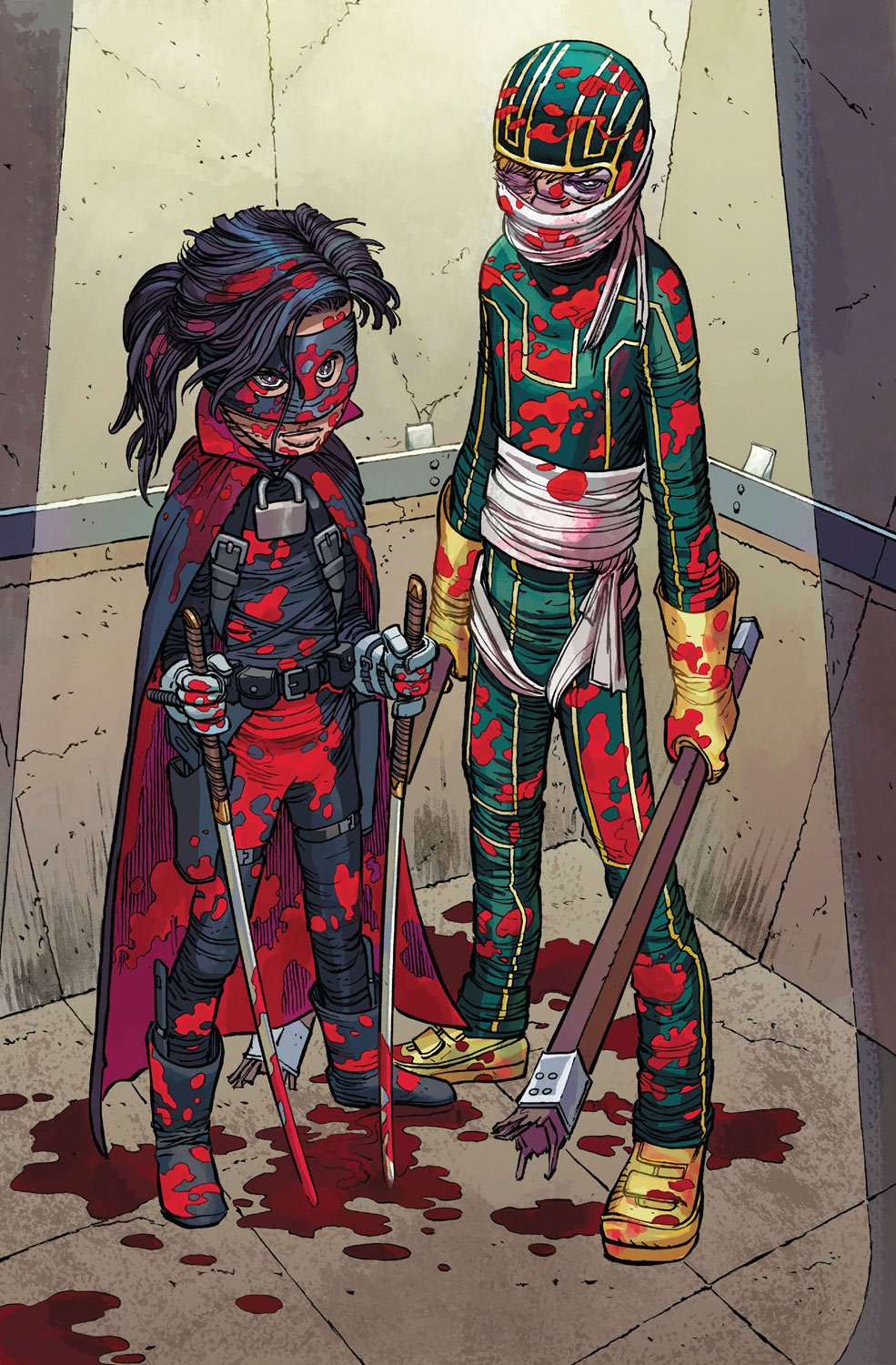 Hit-Girl later insists to her father that they form a "super-team" with Kick-Ass and Red Mist, and Big Daddy reluctantly complies. Big Daddy is revealed to the reader to be "a good cop in a bad city", whose wife was killed because he would not accept bribes from criminals. He escaped with his baby daughter and plotted revenge, training his daughter to become a lethal crimefighter.[6] At the behest of Big Daddy and Hit-Girl, Kick-Ass accompanies Red Mist to meet the duo at an abandoned warehouse to strategize the takedown of John Genovese. There they find Big Daddy and Hit-Girl captured, and Red Mist reveals himself as Genovese's son, who had orchestrated this ambush.[6] Hit-Girl is apparently killed after being shot multiple times and falling through a window. Tortured, Big Daddy reveals he is not an ex-cop at all but an accountant frustrated with his marriage, who took his daughter and left his empty life to create a new one, financing himself through selling comic books. He chose Genovese as a target because he and Hit-Girl "needed a villain". The gang kills Big Daddy and tortures Kick-Ass. Hit-Girl, who is alive due to body armor, saves Kick-Ass.[7] Hit-Girl and Kick-Ass attack Genovese's headquarters. Hit-Girl kills most of the henchmen, while Kick-Ass beats Red Mist unconscious. Genovese and his remaining thugs manage to capture Hit-Girl, but Kick-Ass comes to the rescue armed with a gun and shoots Genovese's penis. Hit-Girl finishes off Genovese with a meat cleaver and guns down the remaining henchmen.[8]