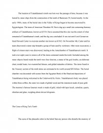 King Tut's Curse the Mummy's Curse and . Words: 1327 Length: 4 Pages Document Type: Essay Paper #: 8869301 . Read Full Paper . King Tut's Curse . The Mummy's Curse and King Tutankhamen . When Howard Carter uncovered King Tutankhamen's tomb in 1922, nobody expected that the historical significance of the find would be plagued by the rumor of a curse .