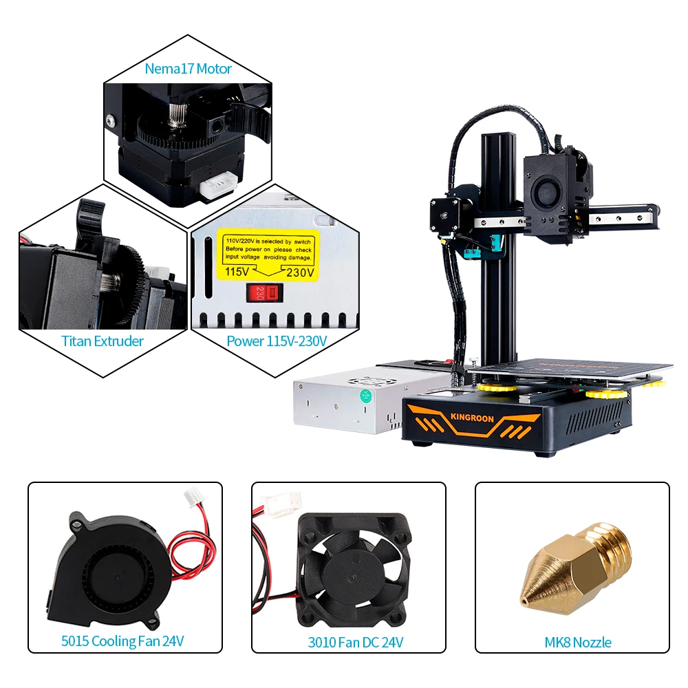 Kingroon KP3S DIY 3D FDM 3D Printer Main Features 1 .Global top 10 DIY FDM 3D printer 2 .Fast heating for hotbed , heatbed reach 110 degree in 8 mins 3 .180x180x180 mm large forming size . 4 .Ultra compact design . 5 .Build with ultra sil