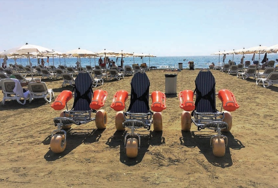 Пафос: Врисудья 1 / СОДАП («плавающая коляска»), Муниципальные купальни (лифт в воду, «плавающая коляска»), Фарос («плавающая коляска»), Аликес («плавающая коляска»).