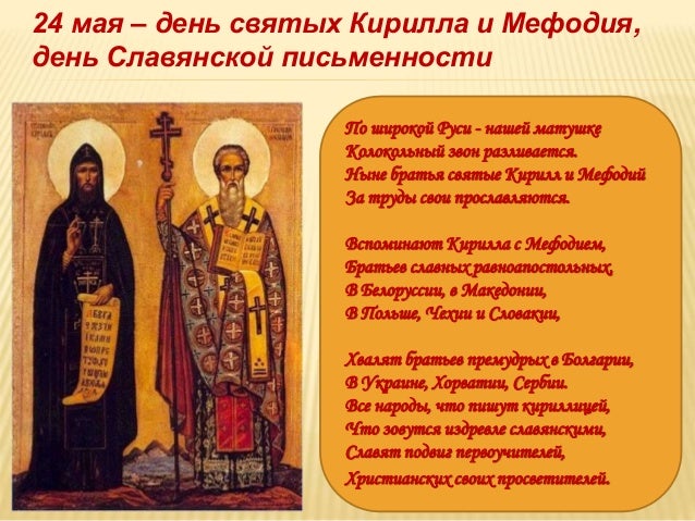 История братьев: Кирилл и Мефодий . 24 мая в России отмечается День славянской письменности и культуры . Праздник приурочен ко дню памяти святых равноапостольных братьев Мефодия и Кирилла — знаменитых создателей старославянской азбуки .
