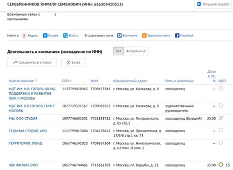 Итак, раскочегариваем «Спарк» — базу данных юрлиц и их учредителей — и наслаждаемся! Вот список юридических лиц, с которыми связан К.С. Серебренников: