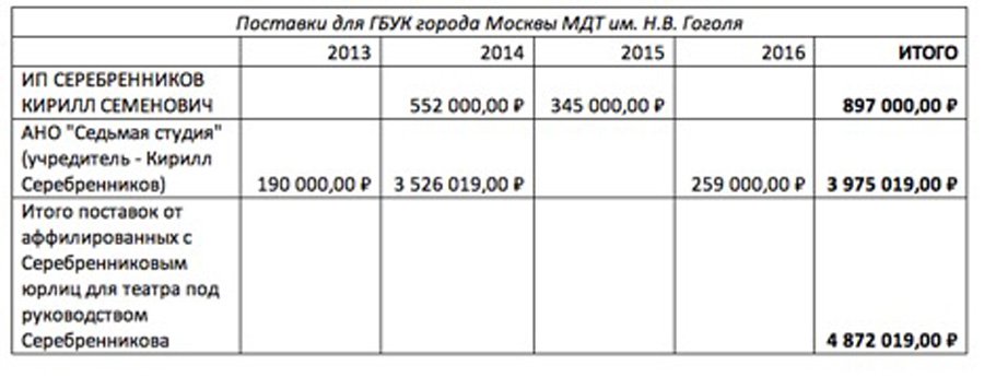 Нас интересуют АНО «Седьмая студия» и фонд «Территория», учредителем которых является Кирилл Семенович. А также ИП Серебренников К.С. (ОГРНИП 307770000588280), созданное полным тезкой нашего героя. И… оказывается, за последние пять лет аффилированные с Серебренниковым компании выиграли у театра, которым он сам же и руководит, тендеры на сумму почти в пять миллионов рублей: