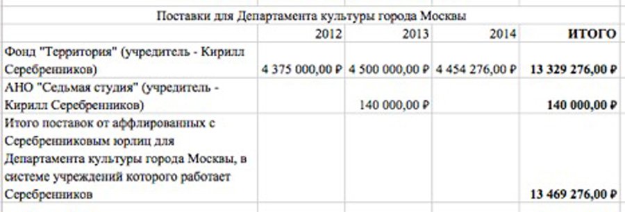 Впрочем, на этом приключения нашего героя в системе госзакупок не заканчиваются. Например, опять-таки по данным «Спарка», в 2012-14 годах Фонд «Территория» и АНО «Седьмая студия», учредителями которых является Серебренников, выиграли у Департамента культуры города Москвы, в системе бюджетных учреждений которого работает Серебренников, тендеры на сумму почти в 13,5 млн рублей: