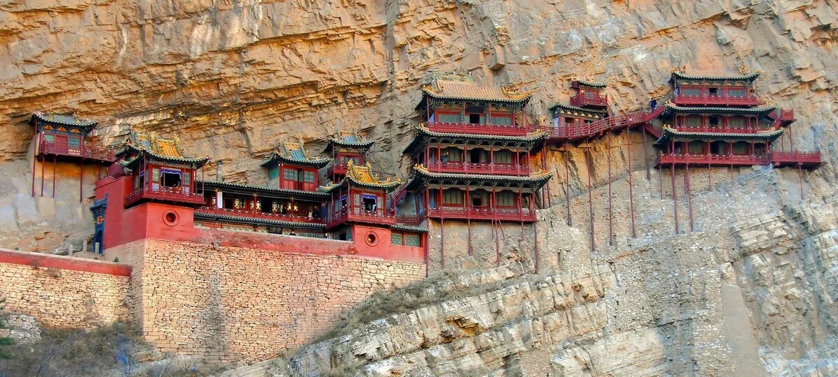 Это чудо архитектуры зависло на горе Хэншань еще 1400 лет назад. Кажется, что конструкция хлипкая и деревянные опоры вот-вот сломаются, но они обработаны тунговым маслом и чрезвычайно прочны. А еще внешние конструкции Сюанькун-сы — лишь малая часть монастыря, а основная вырублена в скале. Внутри нее насчитывается целых 40 залов.