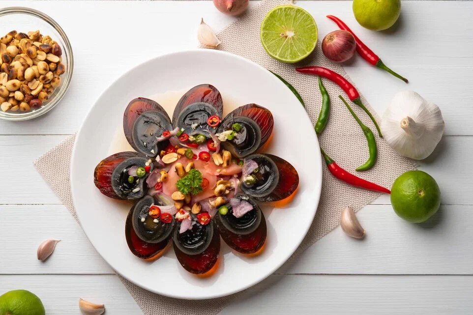 Не знаем, решитесь ли вы, но в Китае это одна из любимых закусок. Яйца выдержаны несколько месяцев под землей в специальной смеси из чая, извести, соли и золы. После снятия скорлупы их оставляют немного «отдохнуть», чтобы выветрился характерный аммиачный запах.