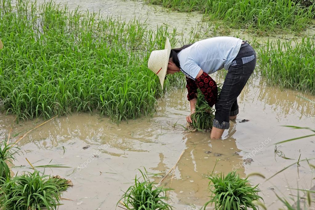 Китаянки сажают рис на рисовом поле, стоя в воде . Сельский Китай, лошадь тянет плуг на рисовом поле . Китайский крестьянин-фермер, выращиватель вспаханное поле, с помощью силы Buffalo . Художественно-дизайнерский фон, на котором человеческая рука кладет рис в почву, в поле . . .