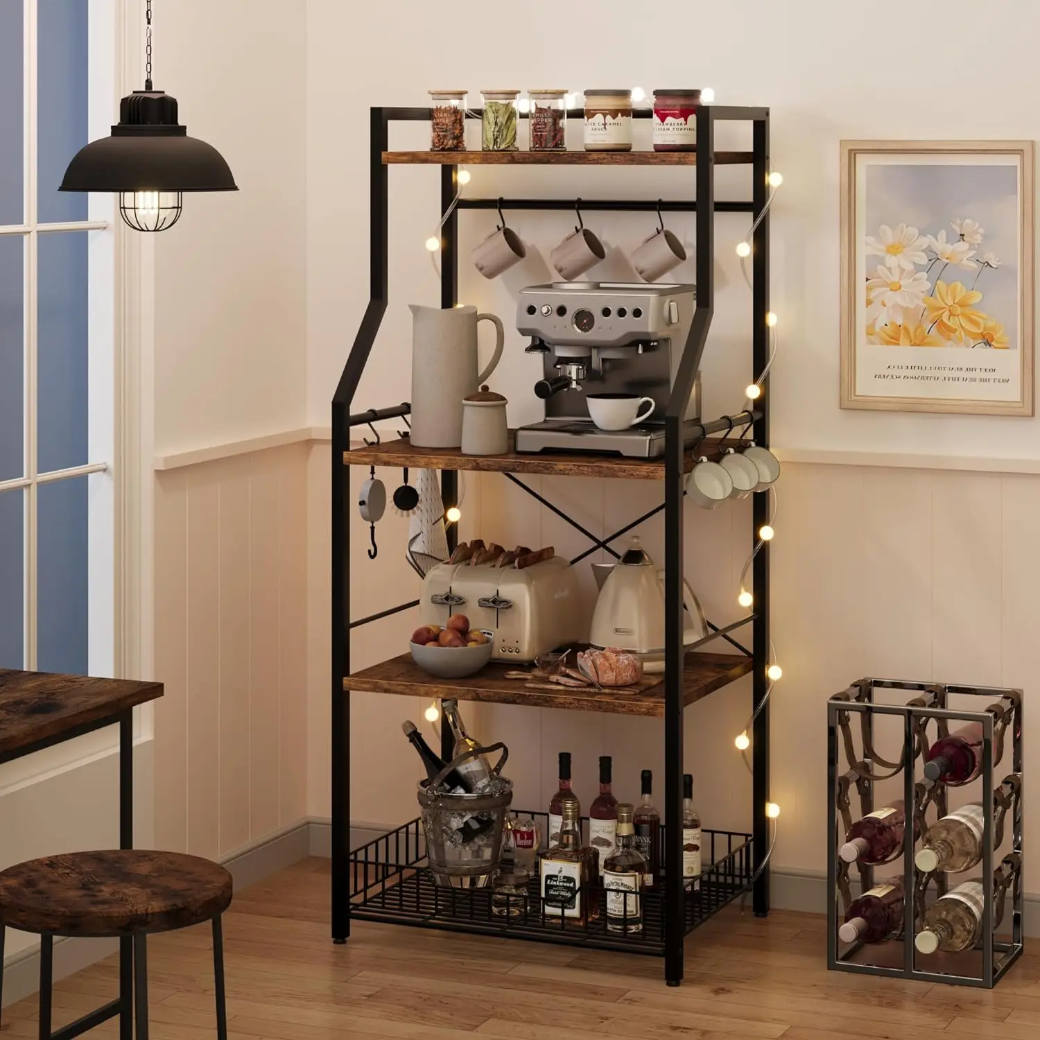 DlsfncAiGHere you can buy Kitchen Bakers Rack, 4-Tier Kitchen Utility Storage Shelf with 8 Hooks for Spice, Pots Organizer, Rustic Brown with free delivery to your post office.