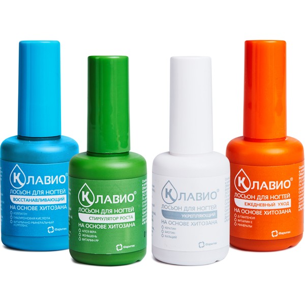КЛАВИО 6 товаров Лосьоны с хитозаном для укрепления и восстановления ногтей Серия лосьонов для ногтей на основе водорастворимого хитозана, витаминов и минералов . На водной основе, без спиртов и эфиров . 4 эффективные формулы для восстановления, укрепления, стимуляции роста и ежедневного ухода . Категории продуктов DERMA КОСМЕТИКА НОГТИ Сортировка