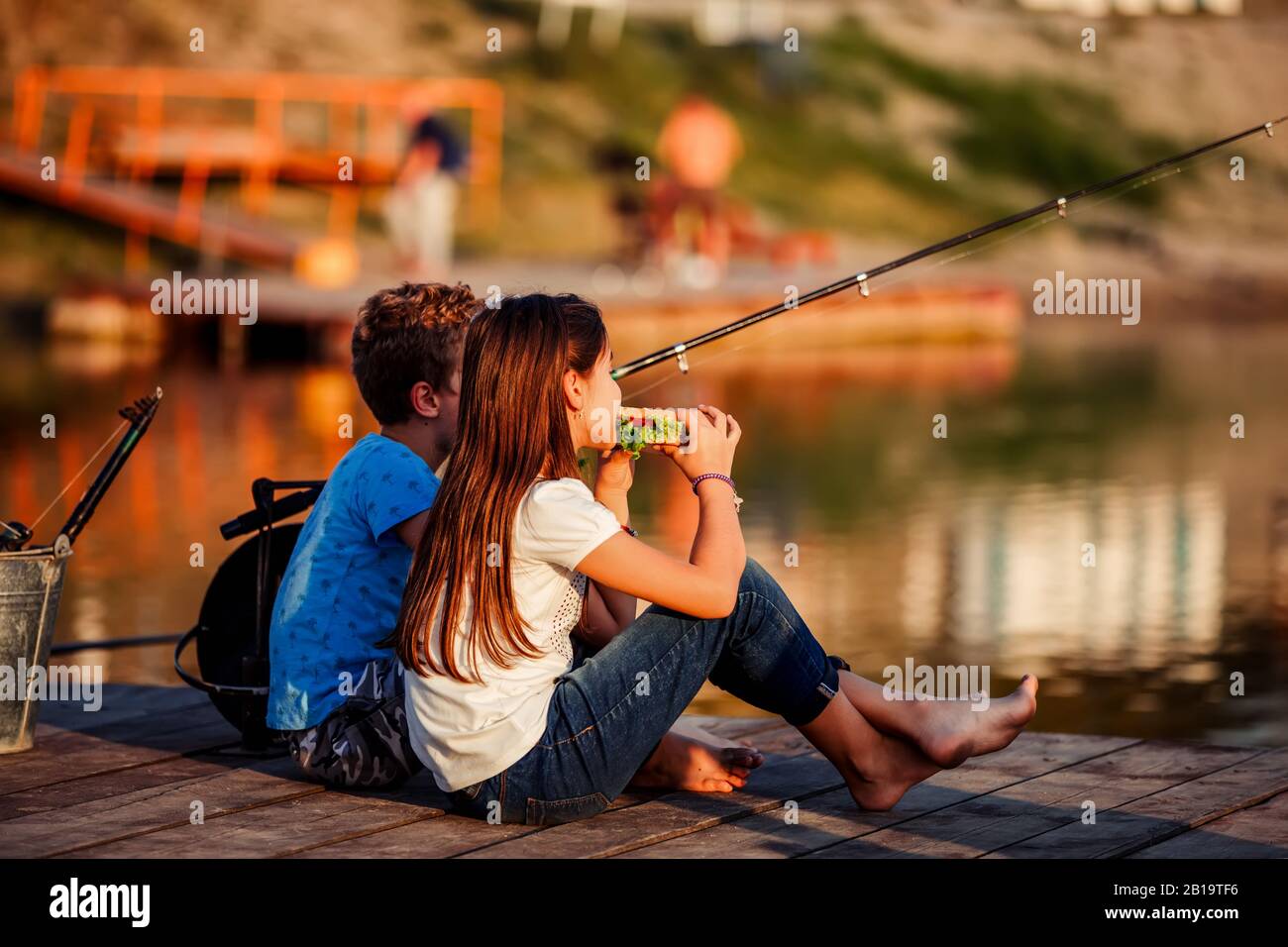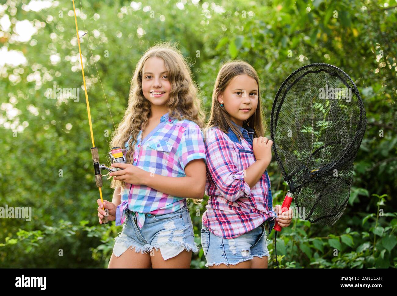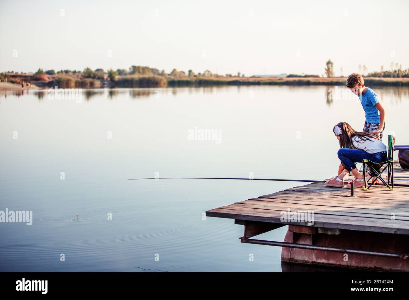 Kleine Mädchen fischen am anderen Ufer
