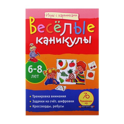 Аннотация к книге "Игры с картинками . Веселые каникулы . 6-8 лет" Эта книга станет незаменимым спутником вашего ребёнка в дороге или на природе . Он отгадает хитрые загадки, пройдет по запутанным лабиринтам, решит кроссворды и ребусы, найдёт отличия в рисунках и ошибки художника, решит простые математические примеры .