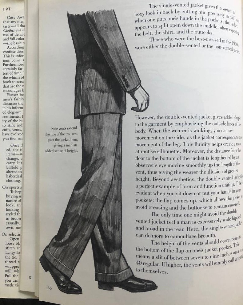 1) Начинать, так с основ. Вот книжка патриарха мужского стиля Алана Флассера. Ей в обед сто лет, но изменения в мужской одежде измеряются десятилетиями и долями сантиметров, так что все норм, котаны. Если хотите узнать про классические пропорции пиджаков, воротников и лацканов, считающуюся канонической длину брюк и рукавов – вам сюда.