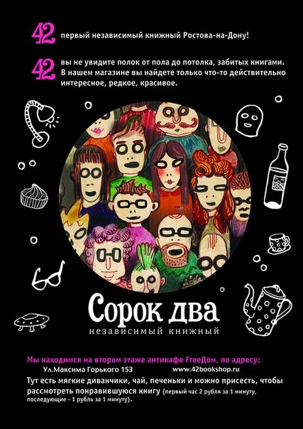 Книжный 42, прежде всего, результат полнейшей авантюры. Так получилось, что, будучи выращенным в тепличных условиях московского Зеленограда, я очутился в не слишком дружелюбном Ростове-на-Дону. Совокупность урбанистических и культурных различий, третий по счёту просмотр сериала Black Books и временная безработица из-за смены места жительства взошли шуточным желанием сделать собственный книжный.
