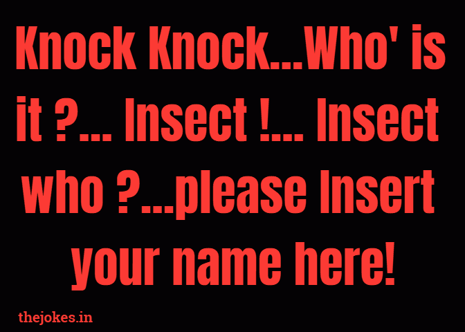Insect Knock Knock Jokes . Here you will find funny, silly and hilarious insect knock knock jokes for children of all ages, teens and adults . Animal Jokes 26 Bird Jokes 16 Cat Jokes 14 Cow Jokes 12 Dog Jokes 19 Insect Jokes 25 . Do you have a funny knock knock joke? Please . . .