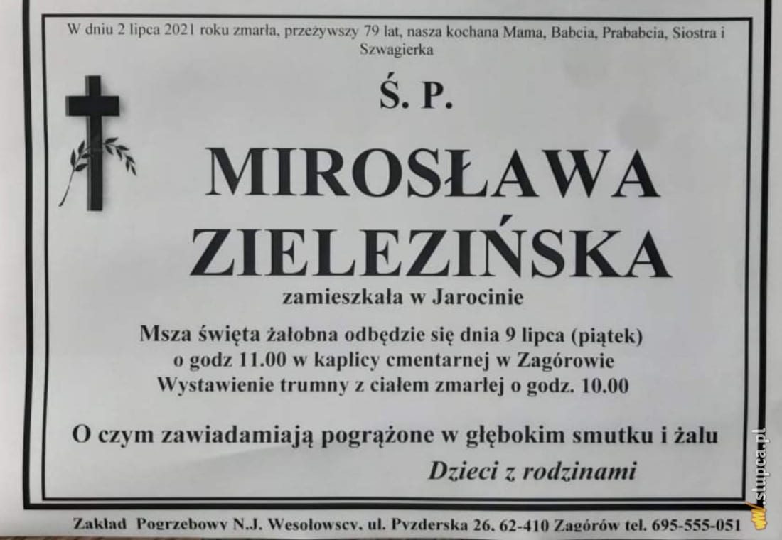 przeżywszy lat 79 zmarła opatrzona Sakramentami Świętymi . moja kochana żona, nasza kochana mama, siostra,teściowa, szwagierka , bratowa, babcia, prababcia, kuzynka i ciocia . ś .p . Kazimiera . Kotwas . z domu Latyńska . Msza pogrzebowa odbędzie się w środę 23 czerwca 2021r o godz . 13:00 .