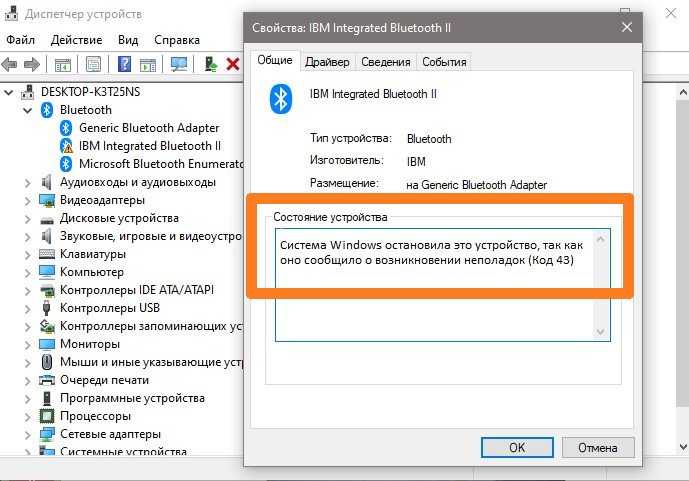 Код неполадок 43 блютуз