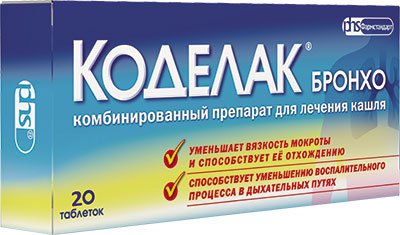 Коделак Бронхо таблетки 20 шт . Препарат для лечения влажного кашля и устранения симптомов гриппа и ОРВИ от 152 ₽ В корзину Есть в наличии в 21 аптеке . Информация о ценах последний раз обновилась 28 .01 .2021 в 14:17 Производитель Фармстандарт-Лексредства ОАО Действующее вещество Коделак Бронхо Форма выпуска таблетки Количество в упаковке 20 таблеток
