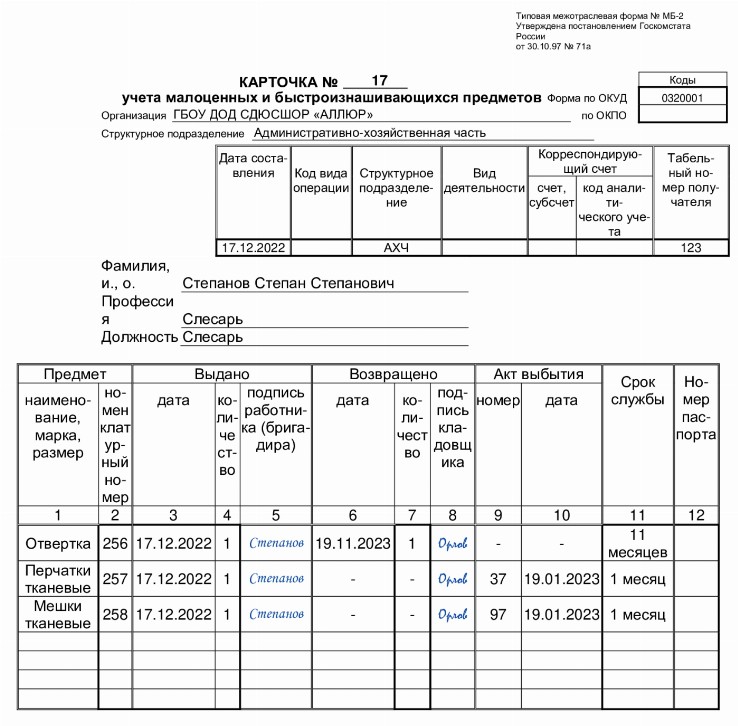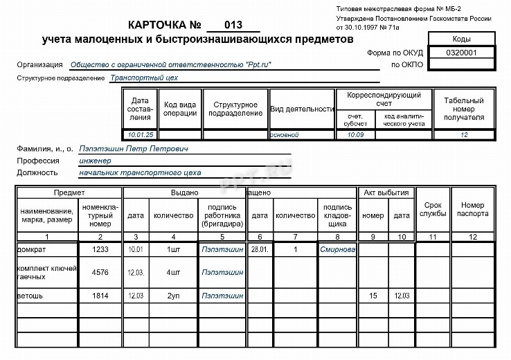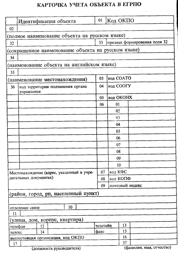 Коды учетной карточки