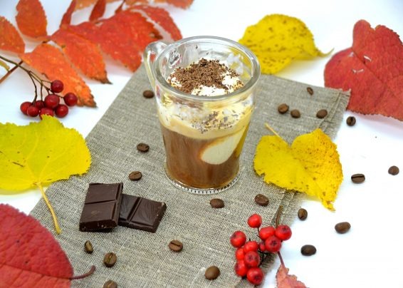 - Добавьте к горячему кофе 2 шарика мороженого, присыпьте сверху тертым шоколадом.