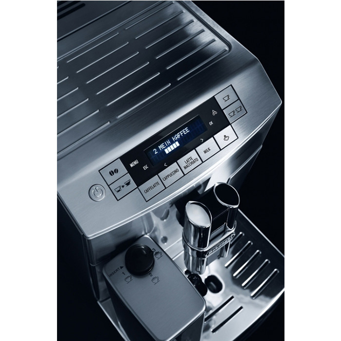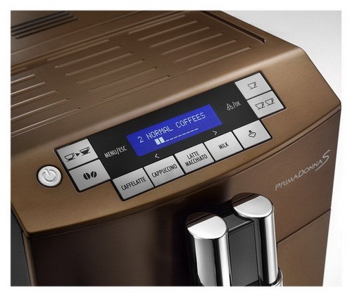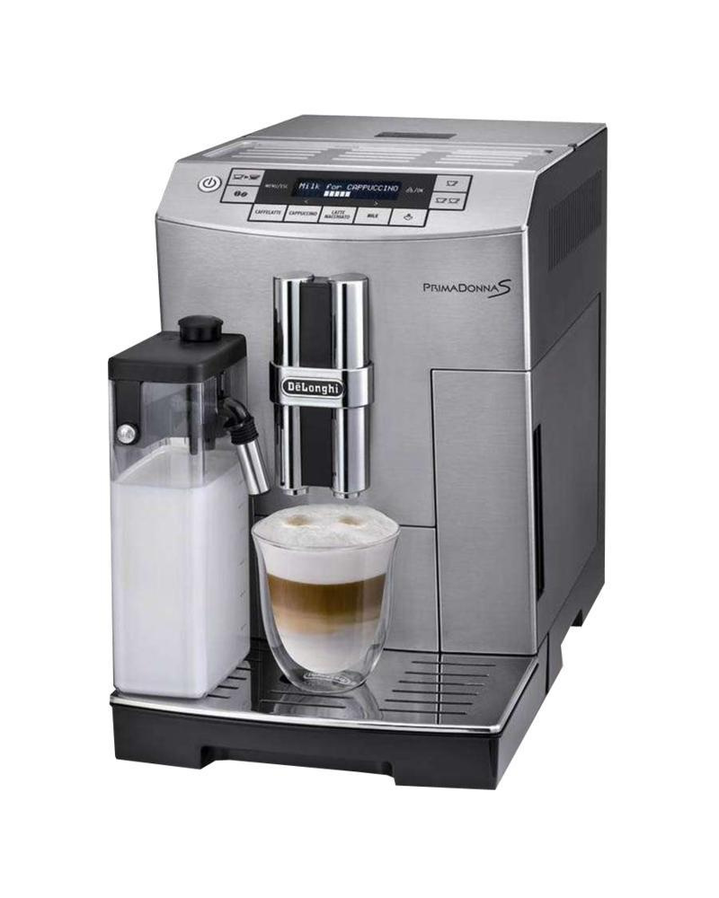 PrimaDonna S ECAM 26 .455 .MB . Compact full metal bean-to-cup machine with the De'Longhi patented automatic cappuccino system . At a touch of a button all your favorite drinks: espresso, coffee, cappuccino, latte macchiato, caffelatte or hot milk . Equipped with 2 text lines display, an extra cappuccino device for hot water or steam, active cup . . .