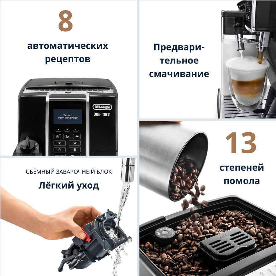 DeLonghi Dinamica Automatic Coffee & Espresso Machine . As known, from the fall of 2016 Dinamica series replaces previous models in the segment of automatic espresso DeLonghi coffee machines . In 2018, this series already included the ECAM 350 .15B, 350 .35W, 350 .55B , and 350 .75S flagship .