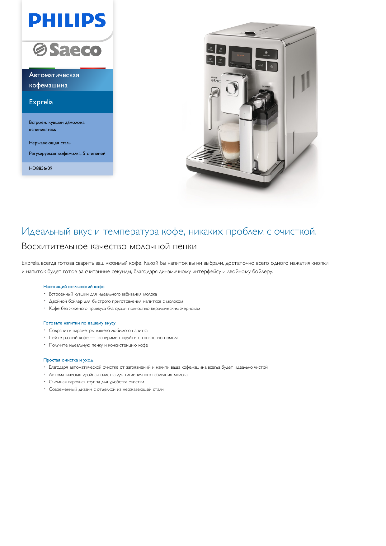 Только эспрессо-кофемашина Saeco Exprelia EVO гарантирует идеальный кофе с молоком благодаря кувшину . . .