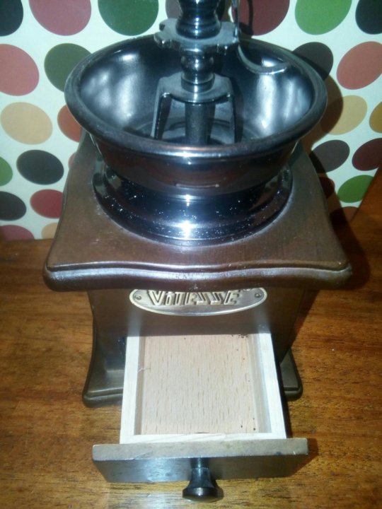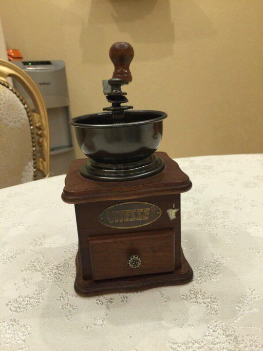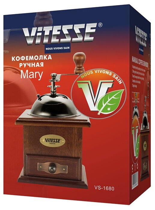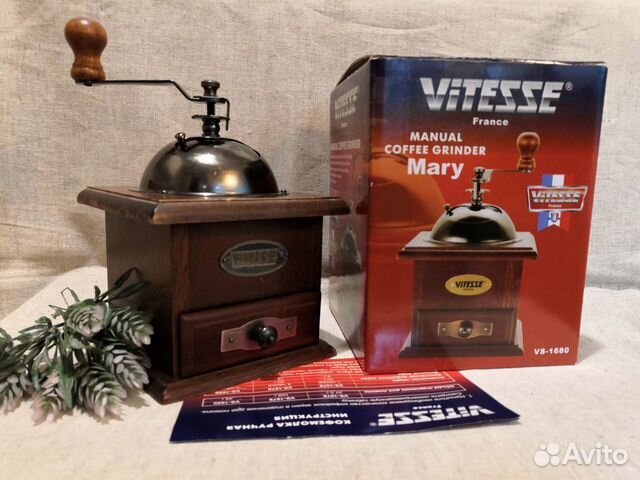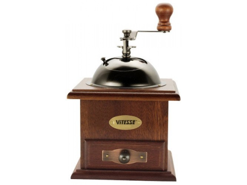 Vitesse VS-1679 . Кофемолка VS-1679 от российского бренда Vitesse является классической элегантной моделью в корпусе из темного полированного дерева . Занимает место в рейтинге как лучшая ручная бюджетная кофемолка . Жернова в кофемолке керамические, поэтому зерна не . . .