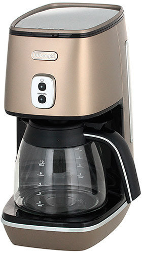 The Delonghi ICM15210 .1 Filter Coffee Machine has a 10 cup capacity and water level window on both sides . The drip-stop mechanism permits removing the jug anytime while coffee is brewing . Additional features include an on/off switch with pilot light, Auto shut off, cord storage and non slip feet .