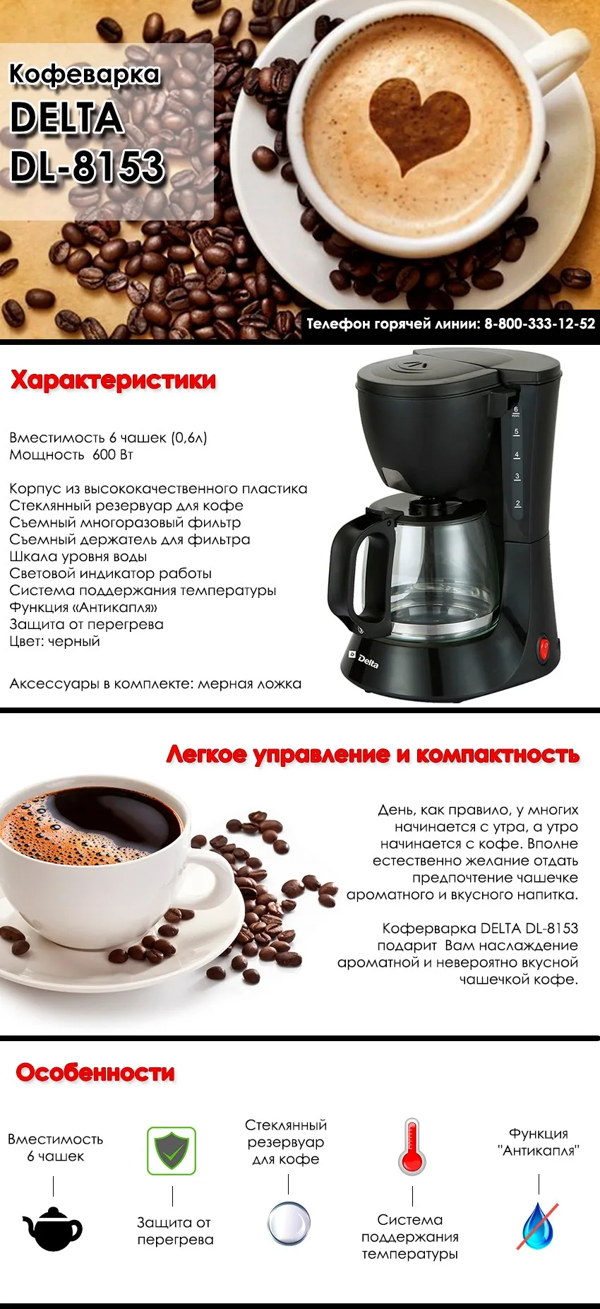 Delta DL-8153 - капельная кофеварка, которая порадует вас ароматным и невероятно вкусным кофе, с которым очень приятно начинать утро .