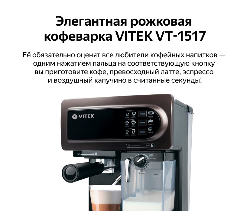 Кофеварка рожковая vitek vt- 1517 bn — купить сегодня c доставкой и гарантией по выгодной цене . 8 предложений в проверенных магазинах . Кофеварка рожковая vitek vt- 1517 bn: характеристики, фото, магазины поблизости на карте .