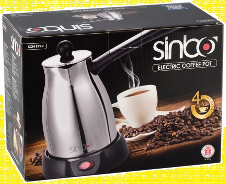 Електрична турка Sinbo SCM 2922 потужністю 800 Вт зручна в експлуатації, має оптимальну місткість (300 мл), розраховану на одночасне приготування 4 чашок кава і функцію обертання на підставці на 360 ° .