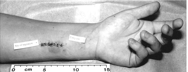 Игла вонзилась в локтевую область, а через сутки её нашли в области плеча. Расстояние за сутки – 22 см [15].