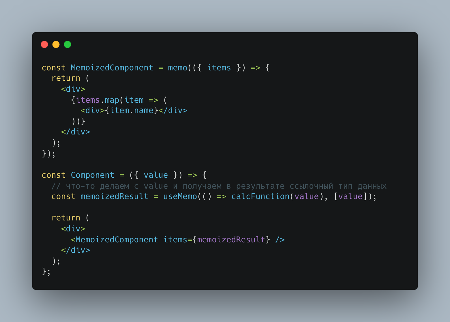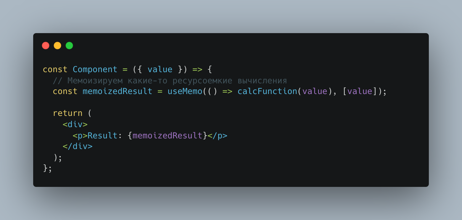 В данном примере у нас есть мемоизированный компонент, который перерисовывается при изменении его пропсов. Он принимает items в качестве массива. Если ссылка на items меняется, компонент перерисовывается. Без мемоизации calcFunction каждый раз возвращает новый массив, нарушая мемоизацию MemoizedComponent из-за изменения ссылки.