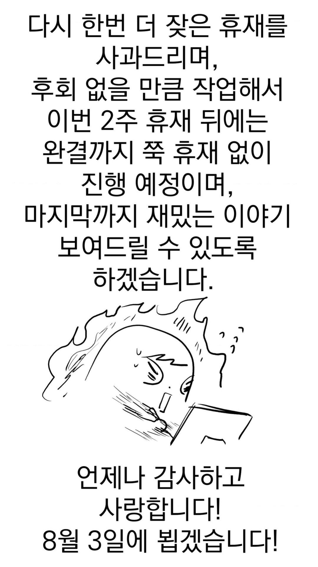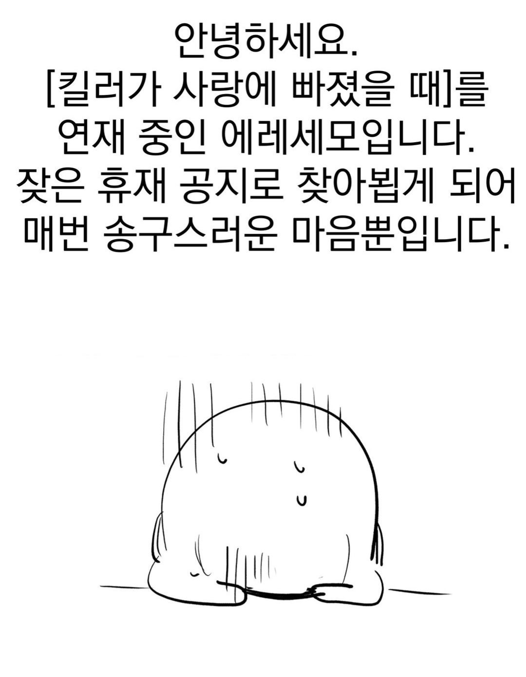 Здравствуйте. Это Эресемо, автор вебтуна «Когда убийца влюбляется». Я очень извиняюсь за частые объявления о перерывах в публикации.