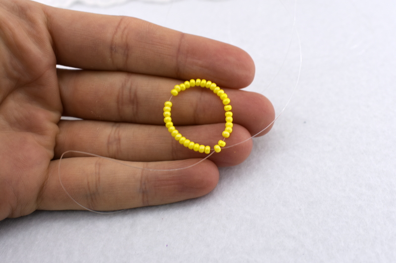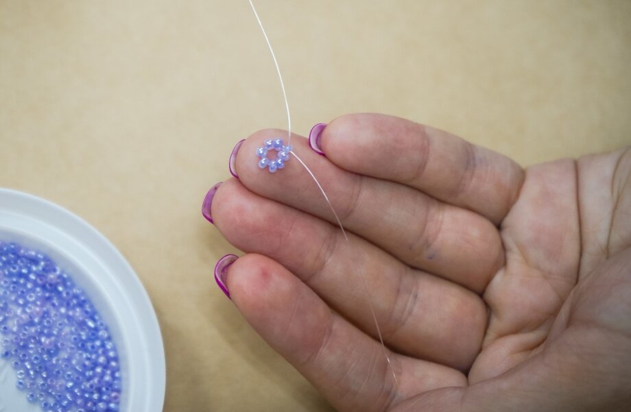 На фото кольца из бисера можно наблюдать будущее украшение . Далее нужно с разных сторон продеть концы лески, через один из элементов .