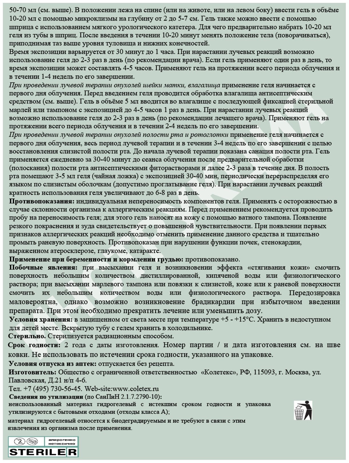 50г . 100г . 321,00 . 597,00 . 6 . ^Салфетка гидрогелевая . «Колетекс-Д» . «Колегель» с димексидом и альгинатом натрия . Для профилактики и лечения лучевых реакций или поздних лучевых повреждений при проведении лучевой терапии злокачественных новообразований в проктологии (прямая кишка . . .